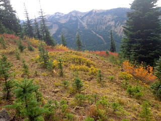 Drove up Hwy 410 towards Crystal Mountain Ski Resort to hike up to Norse Peak. Started at the trailhead that is 4.2 miles up the Ski Resort Road. The trail is mostly evergreen trees, but we did see some fall color today. This hike is 10.8 mile round trip with about 3,000 ft of elevation gain.As we gained elevation while climbing up the switchbacks, we had views of Crystal Mountain Ski Resort and