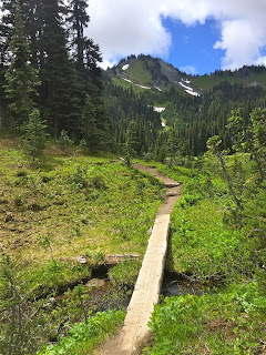 With the clouds lifting, we had different views on the hike back to Sunrise Point. Good visibility of the Sourdough Mountains in the large meadow. It was not clear enough for us to see the Cowlitz Chimneys to the south.