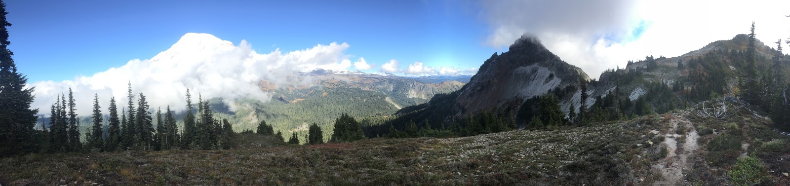Pano from near the saddle looking out at Mt Rainier and Pinnacle Peak.