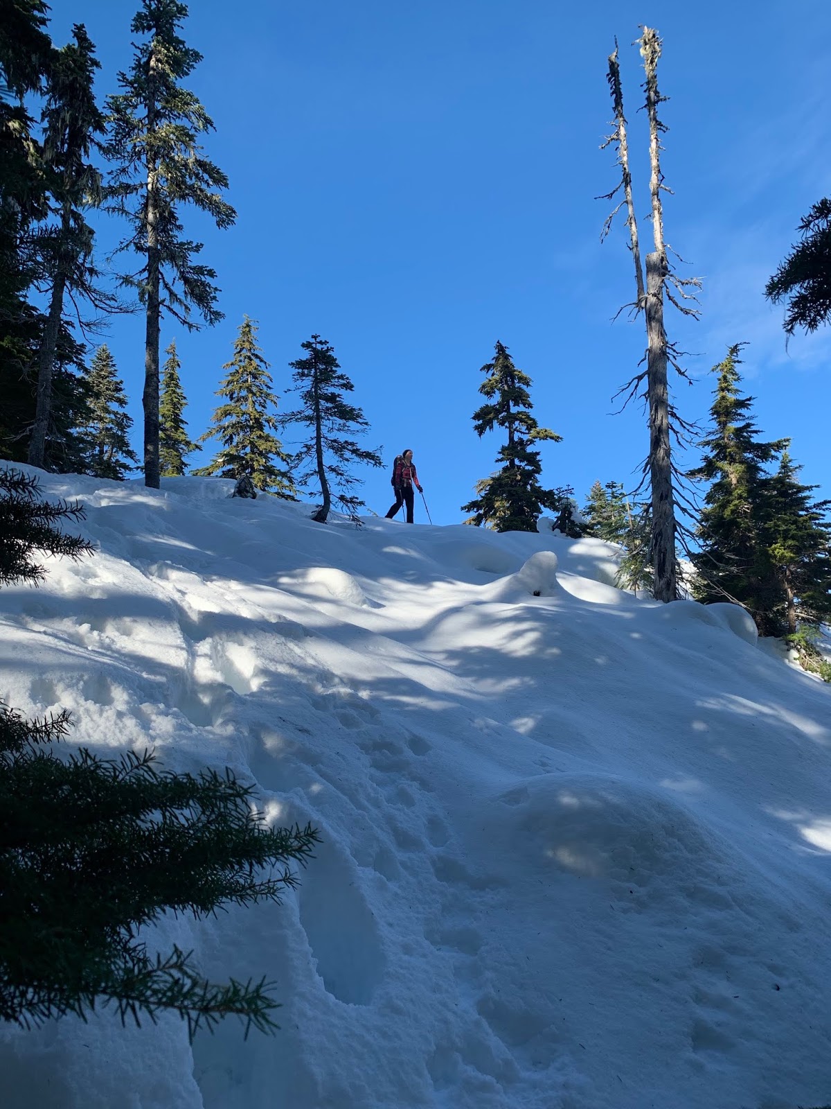 This was the first time on Mount Rose I found a good set of tracks going down the loop on the other side of the summit, so we opted to go down that way. For a while the trail continues along a ridge, here we had peekaboo views of Mt Rainier,