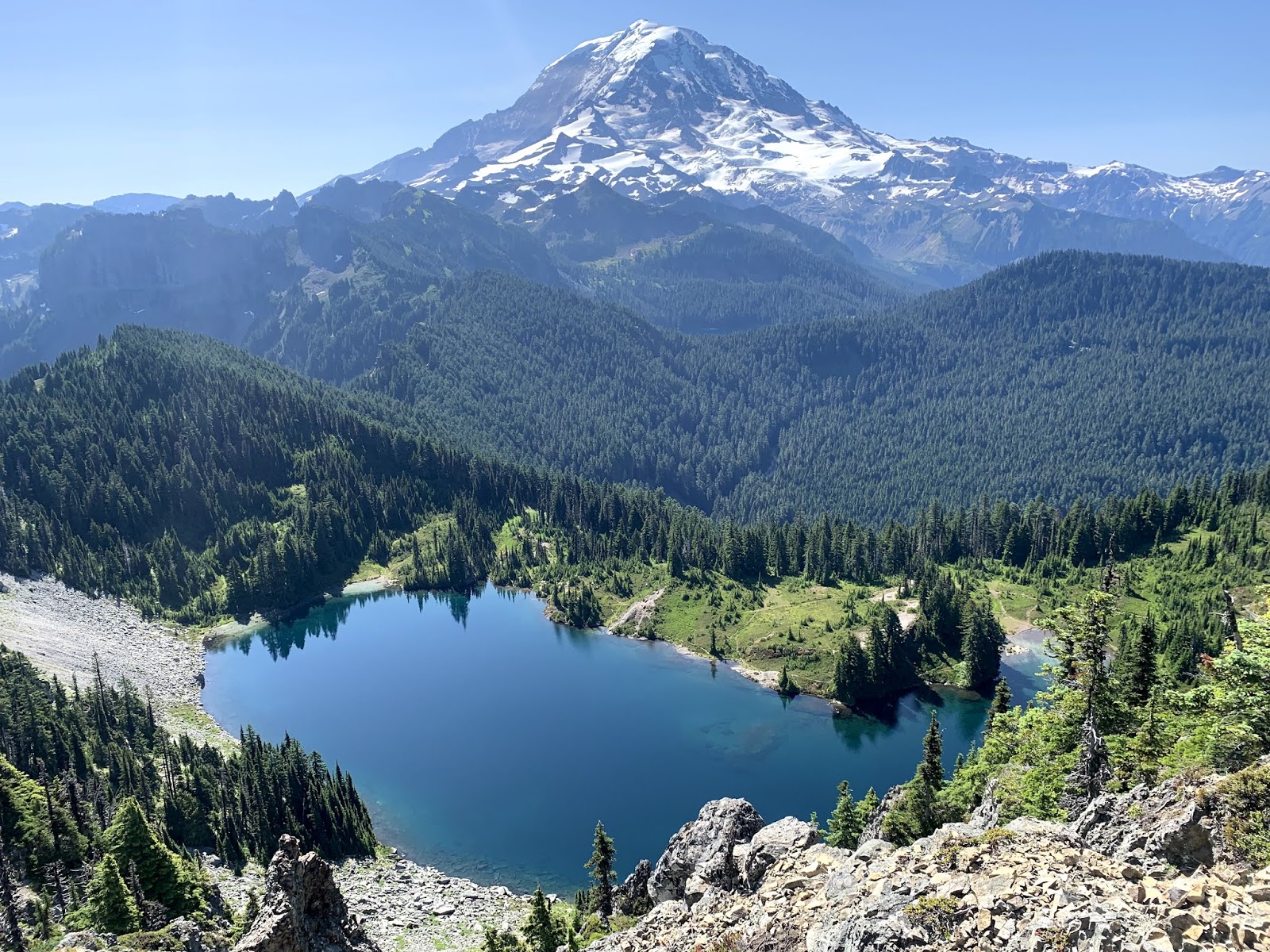 A short ways up through the forest, and we reached Tolmie Peak with a broad open view of Mt Rainier and Eunice Lake.