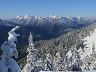 We found a nice spot off trail, out of the wind to take a lunch break. As we were getting ready to continue snowshoeing, up between the trees, for a brief moment, we saw Mount Stuart between the clouds. (zoom)