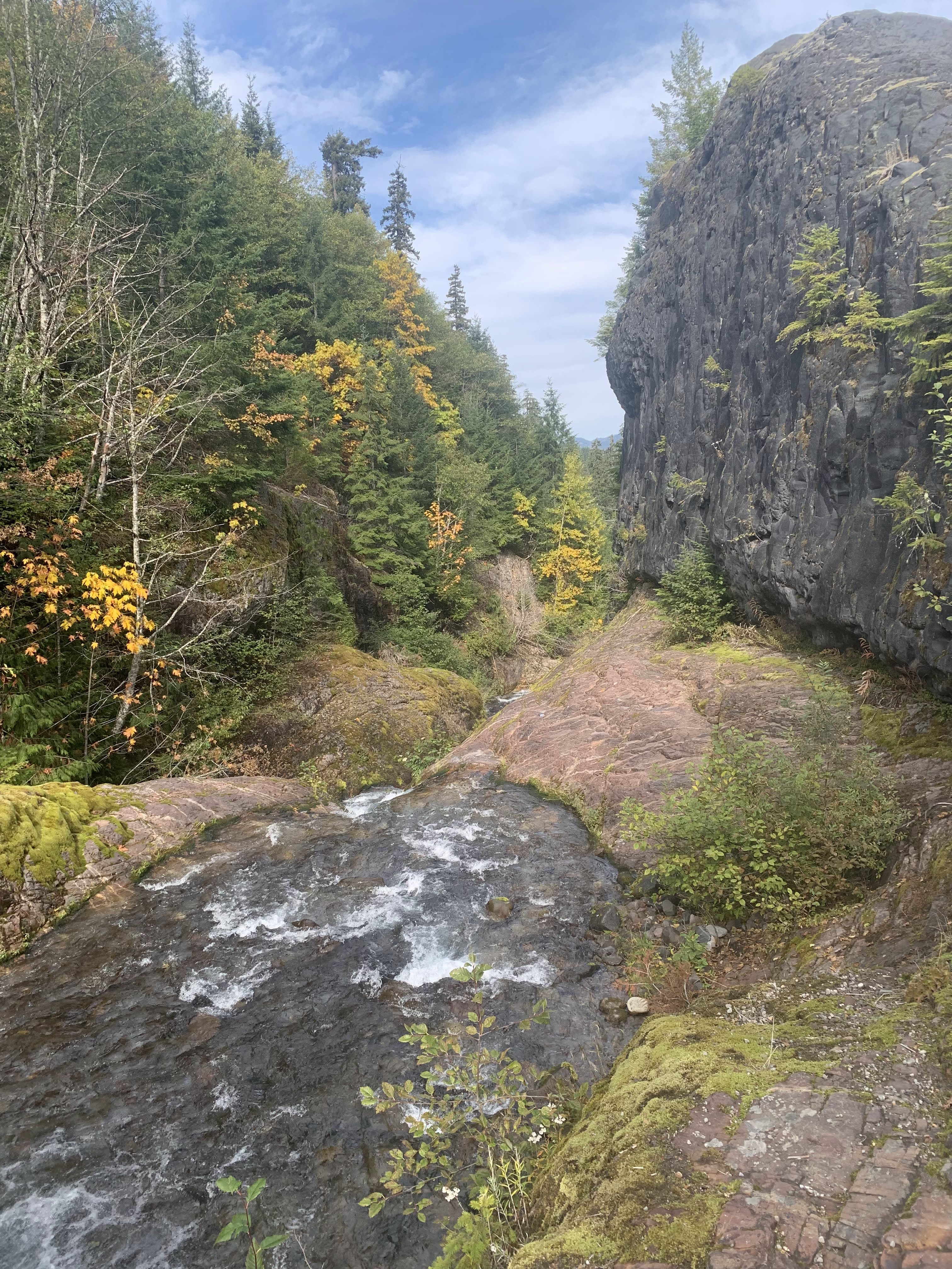At the loop, I went a short ways clockwise to the waterfall viewpoint. Most of the falls were hidden by alder trees.