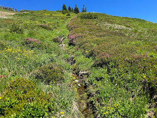 We drove to the Berry Patch Trailhead in the Goat Rocks Wilderness to do a loop hike up to Goat Lake and Snowgrass Flats, about 13 miles with 2,300' overall gain. Beautiful day, with lots of wildflowers in bloom and clear air after two days of rain. We only saw 5 other hikers on our way up to Goat Lake. Several people camping near the lake, and we would see many more hikers and backpackers as we hiked down to Snowgrass Flats and back to the trailhead. Everyone was happy with the views and the flowers.